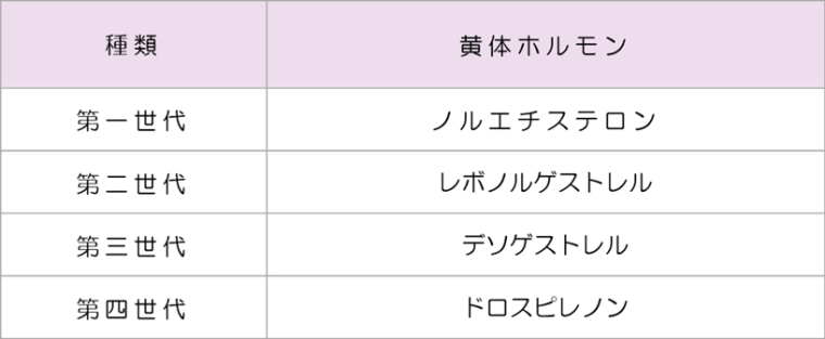 『低用量ピル』は、含有されている黄体ホルモン の違いによって4種類に分けられます。それぞれの効果に大きな差はありませんが、副反応の出方に個人差があります。